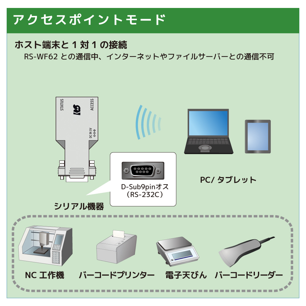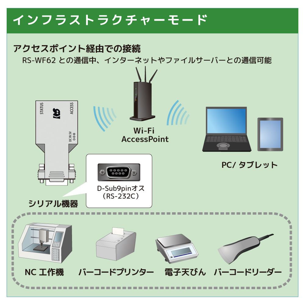 RS-WF62がアクセスポイントのように認識される[アクセスポイントモード]とRS-WF62がアクセスポイントに接続する[インフラストラクチャーモード(INFモード)]をサポートしています。インフラストラクチャーモードを使用することにより、ルーター、VPN経由でシリアル機器にアクセス可能。遠隔地にあるシリアル機器の制御や情報収集が可能となります。