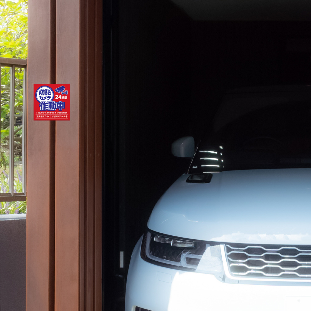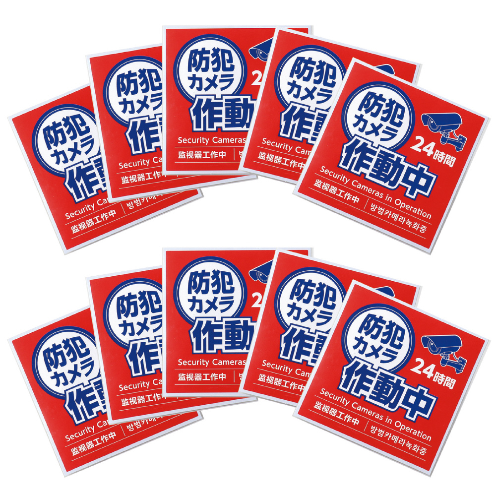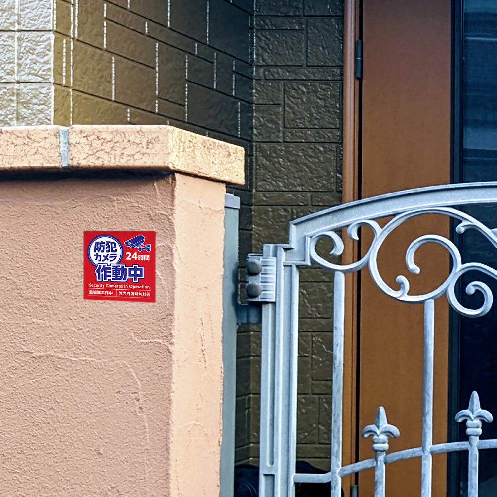 防犯効果をぐっと高める、防犯カメラ作動中ステッカーです。お店の入口や壁面に貼るだけで簡単に注意喚起ができます。防水加工済みで雨の日でも剥がれにくく、直射日光にも強い耐光インキを使用しているため、屋外でも長くご利用いただけます。また、このステッカーには英語、韓国語、中国語でも記載があり、異なる言語や文化を持つ方々にも伝わりやすく、多様な環境で効果的に注意を促すことができます。防犯対策の第一歩として、取り入れやすいステッカーです。
