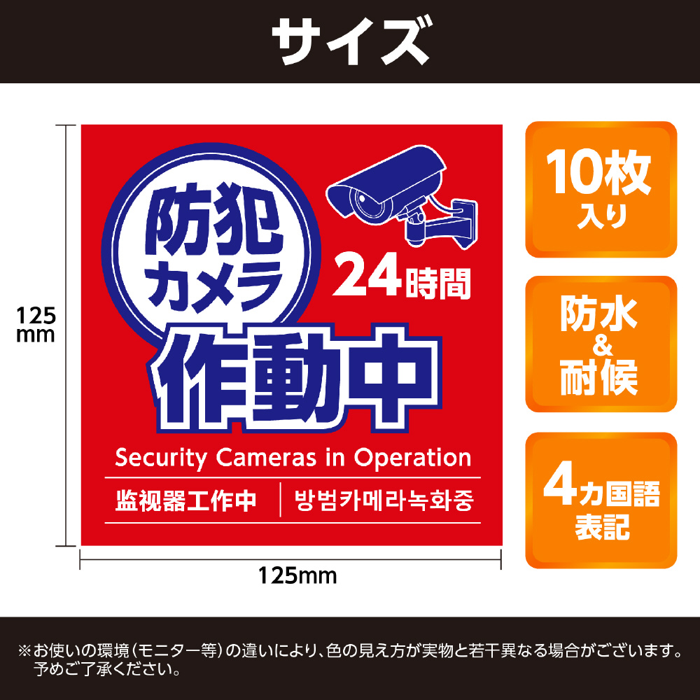 防犯カメラ作動中ステッカー125×125mm 10枚セット 36607