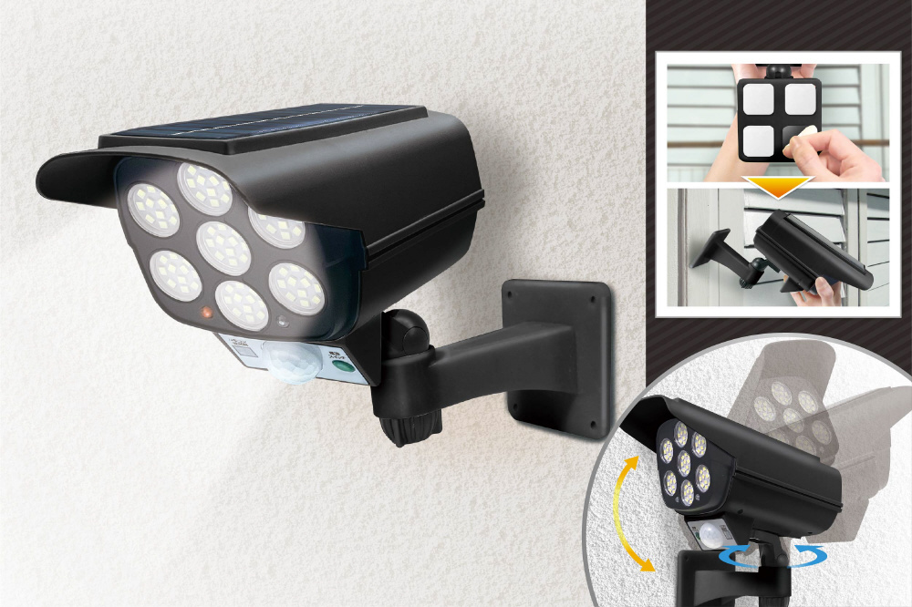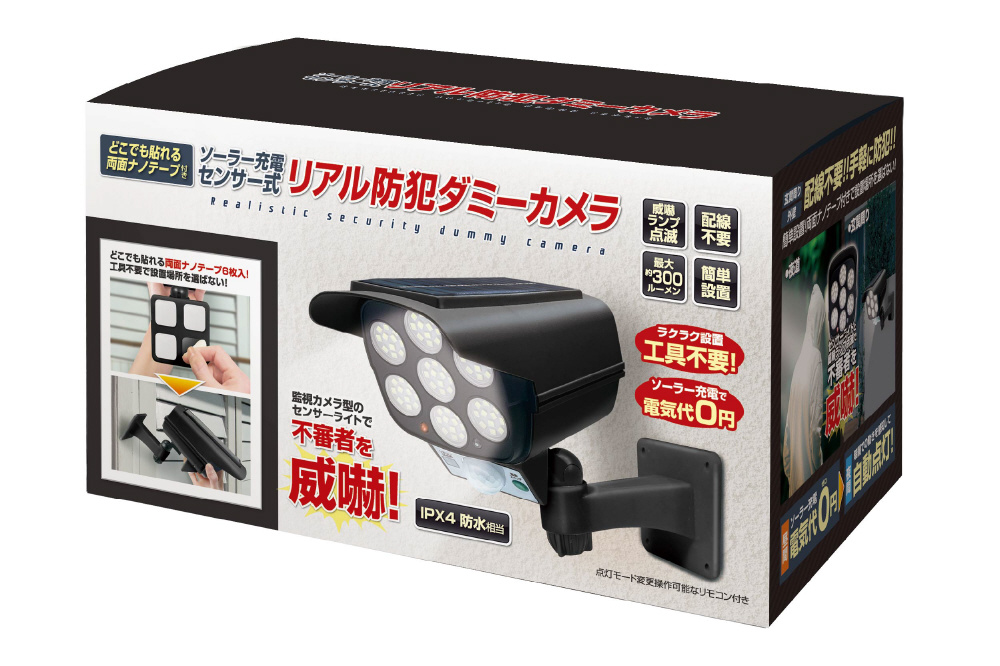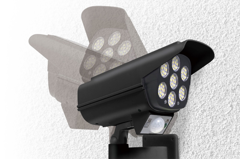 本物の監視カメラのような外観と、強力なLEDライトによる自動点灯で、設置場所の周囲をまるでカメラで監視しているかのよう。