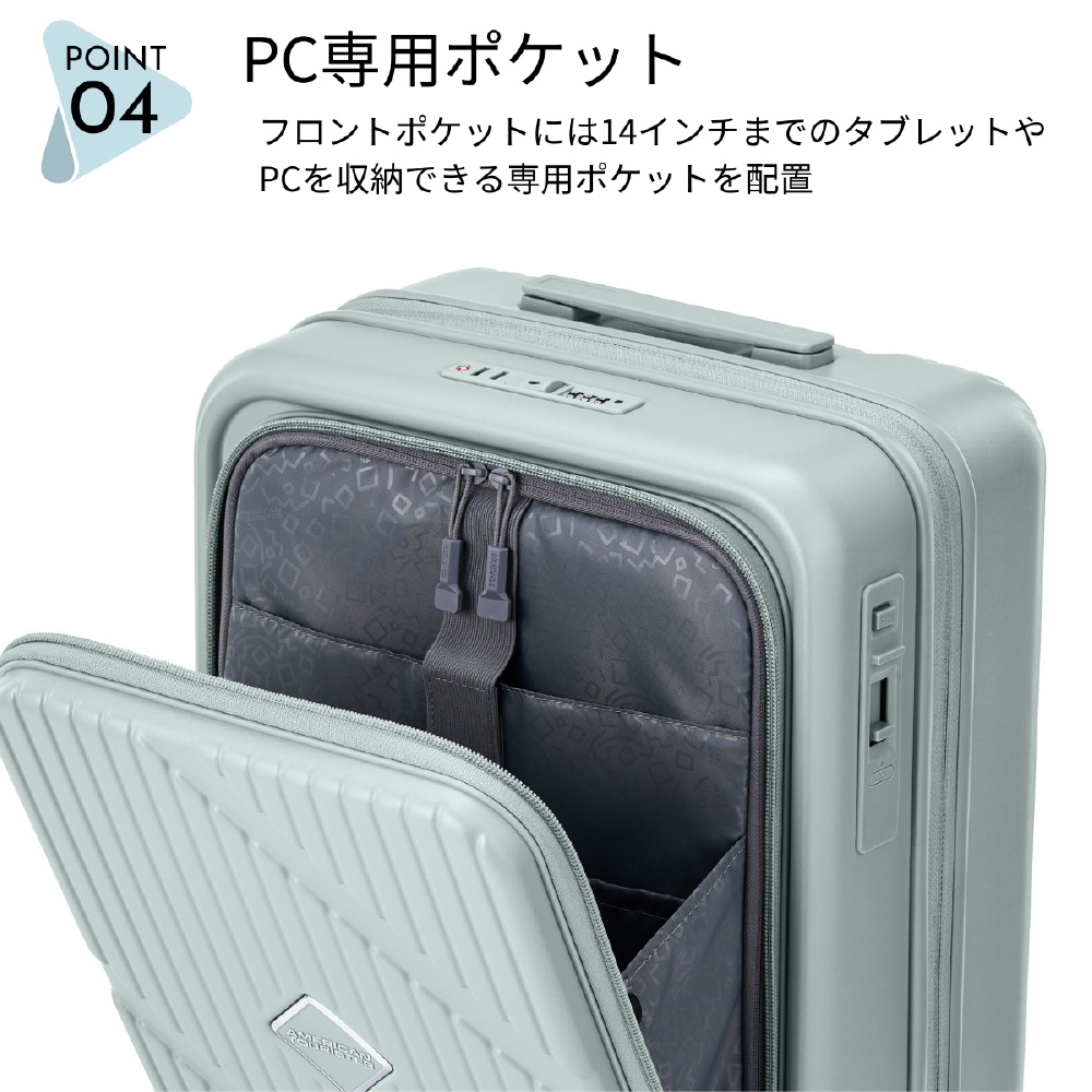 スピナー54は、1〜3泊程度の旅行に最適な機内持ち込み対応サイズ。新幹線・電車等で移動する国内旅行や修学旅行、短期の出張におすすめです。フロントポケットにはPC、タブレットなどの収納スペースがありビジネスシーンでも活躍します。