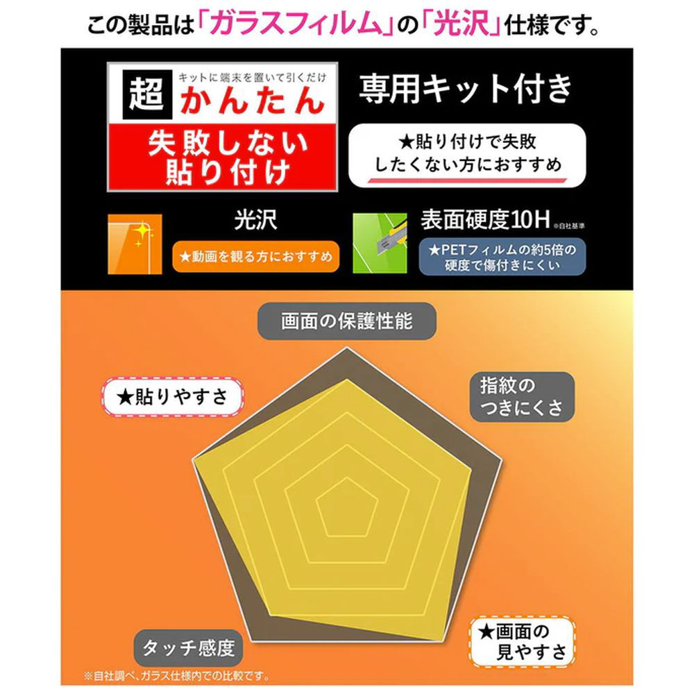高い透明感で画面の美しさをそのまま楽しめる光沢タイプのガラスフィルム。