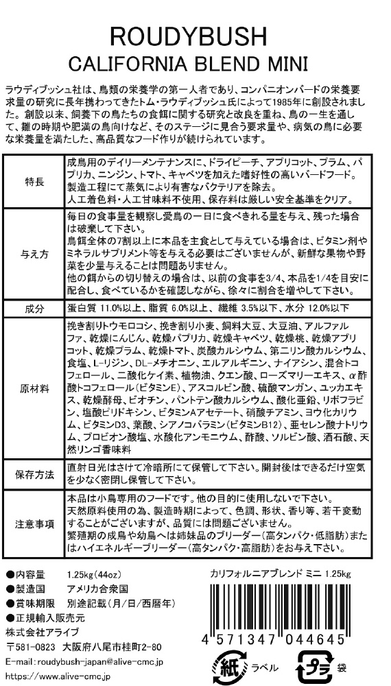 ・成鳥用のデイリーメンテナンスに、ドライピーチ、アプリコット、プラム、パプリカ、ニンジン、トマト、キャベツを加えた嗜好性の高いバードフードです。