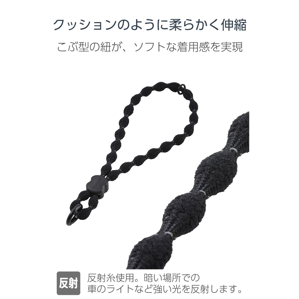 特許取得のこぶ型ひもを使った、柔らかく伸びるAIRFLEXシリーズのスマホハンドストラップです。手首に掛けたままでも写真撮影や電子決済がスムーズにでき、両手が空くので外出やお出かけも快適。反射糸が光を反射するため、夜間の外出時も安心して使えます。