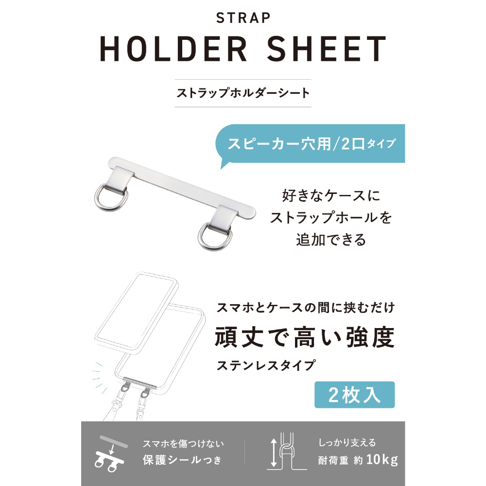スマホ ストラップホールシート 挟むだけ スマホケース スピーカー穴対応 2口タイプ ステンレス製 薄型0.2mm 耐荷重10kg スマホショルダー・ハンドストラップ用 落下防止 保護シール付き