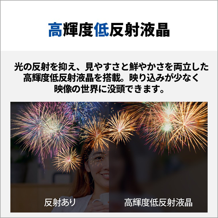 光の反射を抑え、見やすさと鮮やかさを両立した高輝度低反射液晶を搭載。暗いシーンを視聴している時にも、映り込みが少なく映像の世界に入り込むことができます。