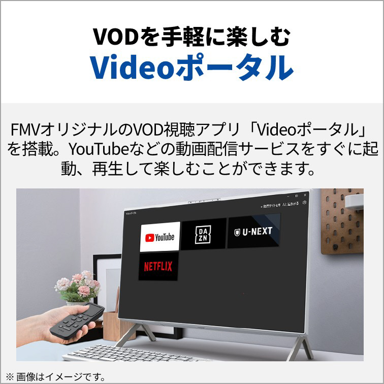 FMVオリジナルのVOD視聴アプリVideoポータルを搭載。YouTubeなどの動画配信サービスをすぐに起動、再生して楽しむことができます。さらに付属のVideoポータルリモコンを使えば、動画配信サービスを手元でサクサク簡単に操作することができます。
