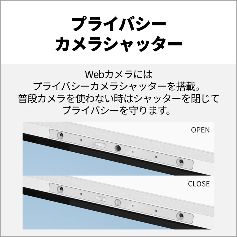 物理的にWebカメラのレンズを隠せる、プライバシーカメラシャッター搭載。動画やWeb視聴時、パソコンを使わない時には閉じておけば安心です。