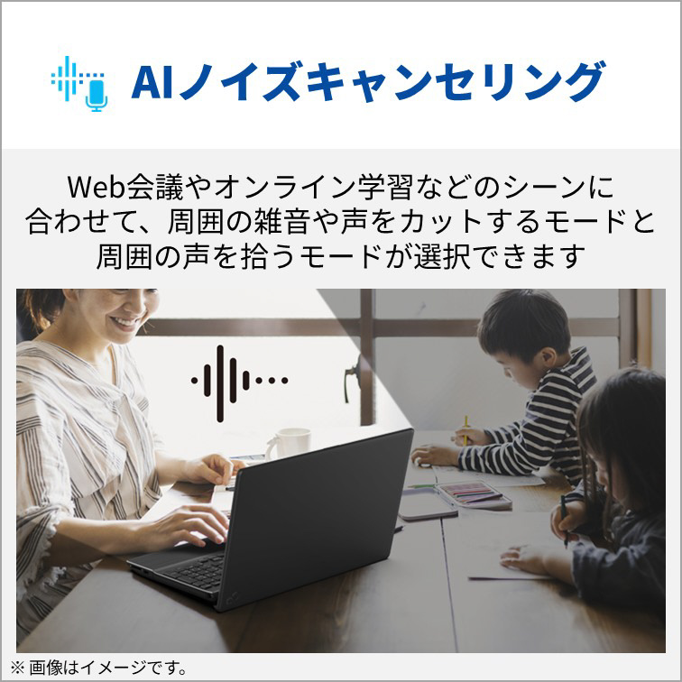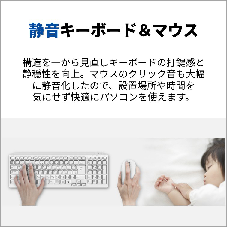 押し心地の良い約3mmのキーストロークを確保して、キーごとの反応過重までこだわり抜いたキーボードは、打鍵音も大幅に静音化。クリック音を大幅に静音化した静音マウスと合わせ、Web会議中の操作も夜中のWeb閲覧も周囲を気にすることなく快適にパソコンを使えます。