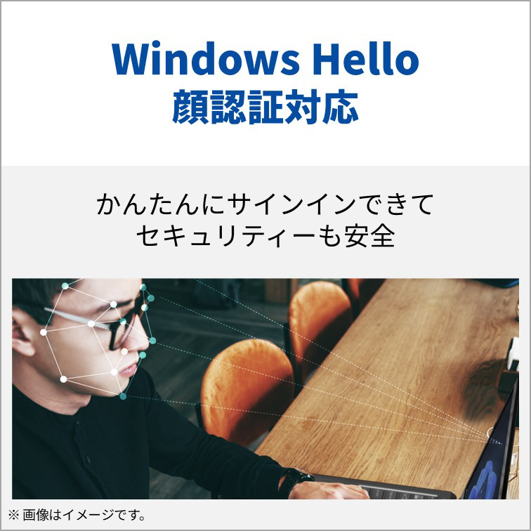 WindowsHello顔認証に対応したWebカメラを搭載。複数人でFMVを共用する際にも面倒なアカウント入力なく、スピーディに起動できます。