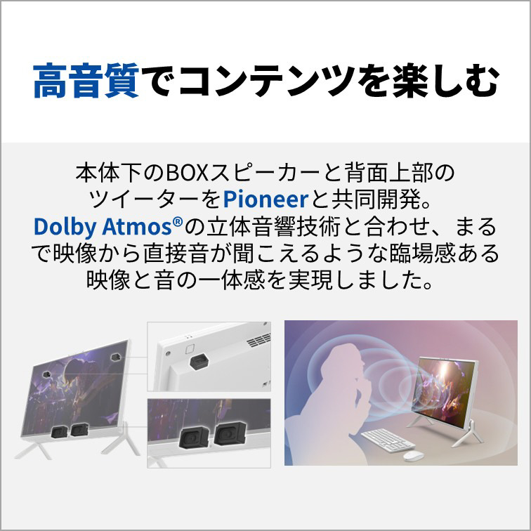 Pioneerと新開発した2+2chスピーカーシステムで、高音域から低音域までを豊かに再現。さらにDolbyAtmosの空間オーディオ技術により、対応コンテンツを立体音響で楽しめます。