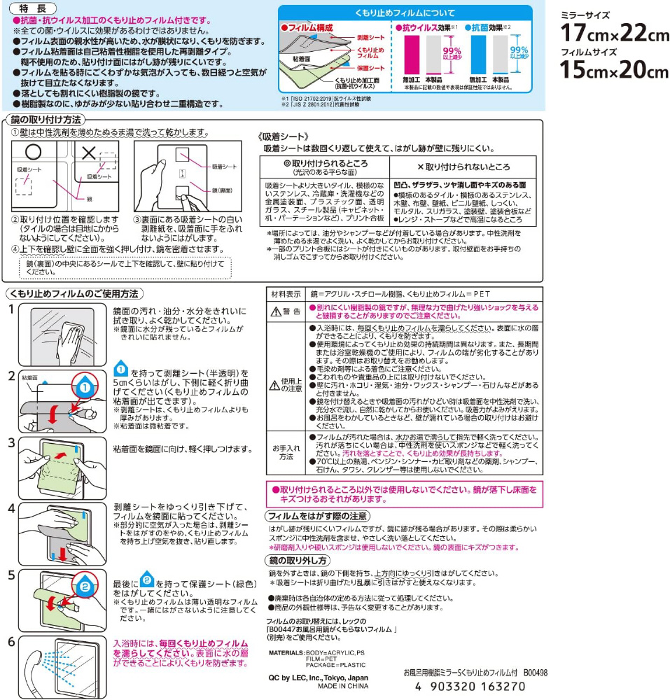 抗菌・抗ウイルス加工のくもり止めフィルム付きです。※全ての菌・ウイルスに効果があるわけではありません。フィルム表面の親水性が高いため、水が膜状になり、くもりを防ぎます。フィルム粘着面は自己粘着性樹脂を使用した再剥離タイプ。糊不使用のため、貼り付け面にはがし跡が残りにくいです。フィルムを貼る時にごくわずかな気泡が入っても、数日経つと空気が抜けて目立たなくなります落としても割れにくい樹脂製の鏡です。
