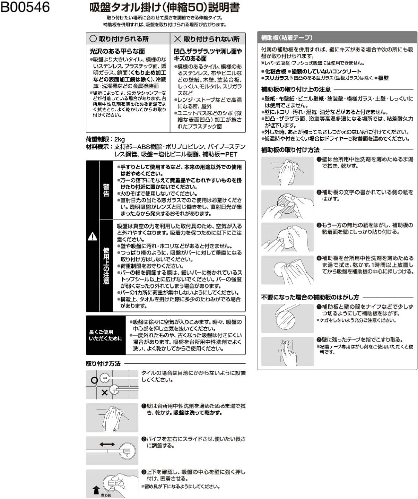 仕様2 材質:<材料>支持部=ABS樹脂・ポリプロピレンパイプ=ステンレス鋼管吸盤=塩化ビニル樹脂補助板=PET