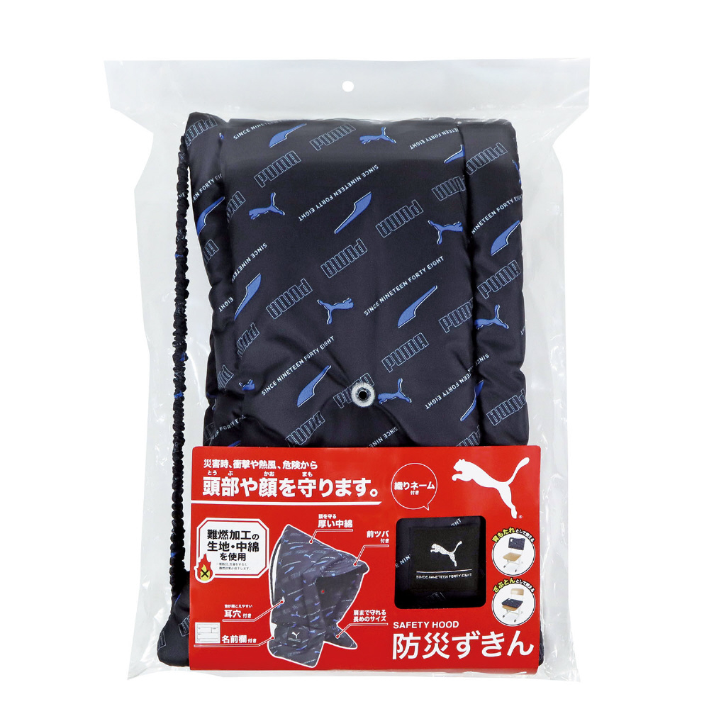 災害時、衝撃や熱風、危険から頭部や顔をまもる、PUMAの防災ずきんです。 難燃加工の生地・中綿を使用 危険物や衝撃から頭を守る厚い中綿入 折りたたみ式前ツバ付 聞こえやすい耳穴付 緊急時に必要な名前欄付 学校用椅子に座布団や背もたれとして取付可