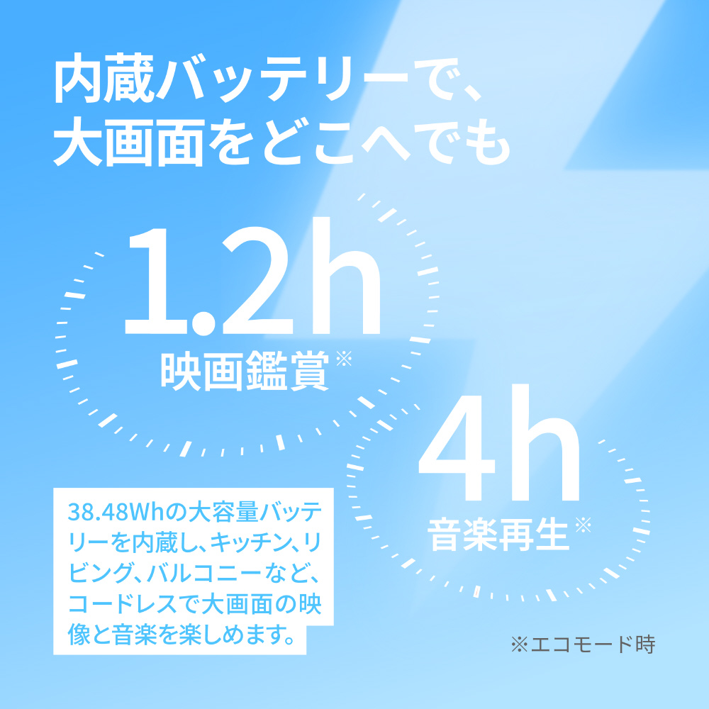 内蔵バッテリー(約1.2時間動画再生)により、リビング・寝室・アウトドアなど、コンセントを気にせず使用可能。