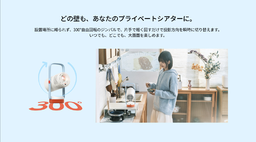本体一体型の300°回転スタンドにより、壁投影はもちろん、ベッドで寝転びながらの天井投影にも対応。