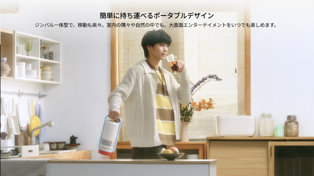 内蔵バッテリー(約1.2時間動画再生)により、リビング・寝室・アウトドアなど、コンセントを気にせず使用可能。