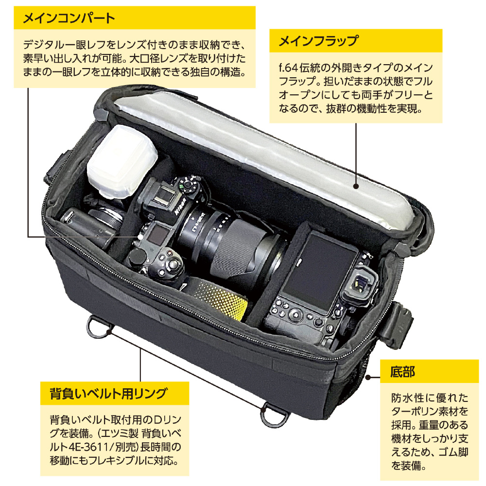 著名なカメラマンが名を連ねる芸術写真家集団「f.64グループ」。その名を冠したカメラバッグブランドf.64より、カメラ2台を同時に収納できる高さと奥行きを備えたスクエア型ショルダーバッグ。