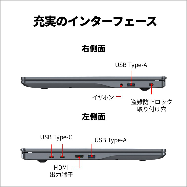 最大40Gbpsのデータ転送を実現するThunderbolt4に対応したUSBType-C端子を2つ搭載。USBType-C接続の外部ディスプレイならケーブル(別売)一本で接続できます。さらにディスプレイがPowerDelivery対応※の場合、一本のケーブルでディスプレイ出力とパソコンの充電が同時にでき、デスクがすっきり使えます。