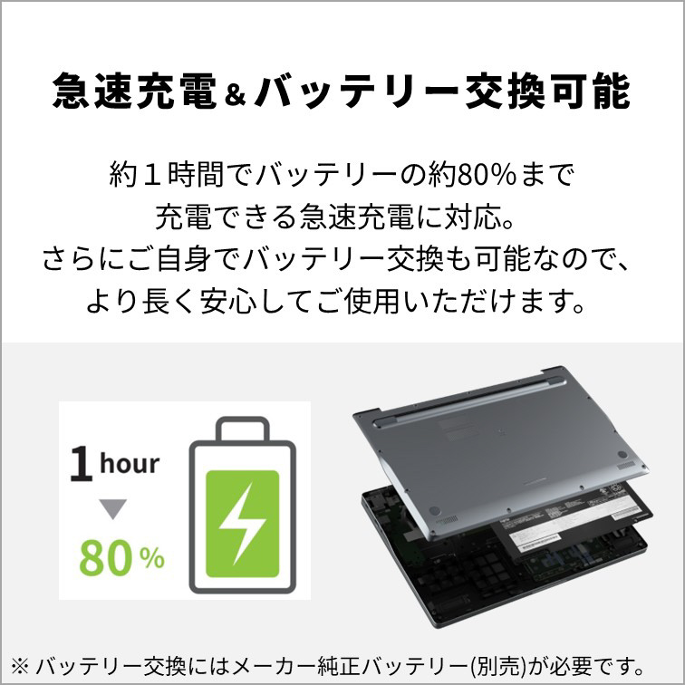 内蔵バッテリーの取り外しが可能になっています。パソコンの中でも特に劣化や消耗をしやすいバッテリーをお客様ご自身で交換できる※ので、長く快適に使用することができます。