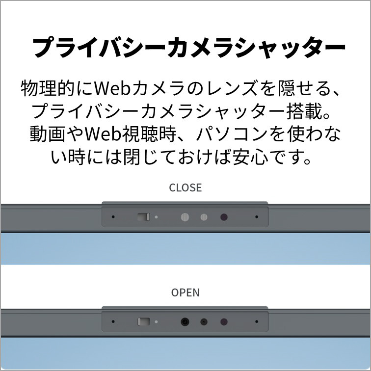 500万画素Webカメラを搭載。フルHDを超える高解像度のWebカメラでより鮮明に映し出すことができます。またWindows Hello対応なので、素早いサインインはもちろん家族内のアカウント管理もかんたんです。カメラを使用しない時は物理的にシャッターを閉じることで、プライバシーを守ることができます。
