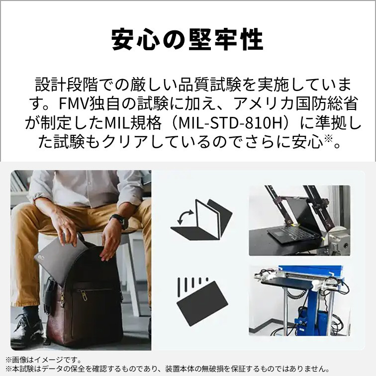 日常で起こりうる様々なケースを想定し、設計段階での厳しい品質試験を実施しています。富士通独自の試験に加え、アメリカ国防総省が制定したMIL規格(MIL-STD-810H)に準拠したテストもクリアしているのでさらに安心にご使用いただけます