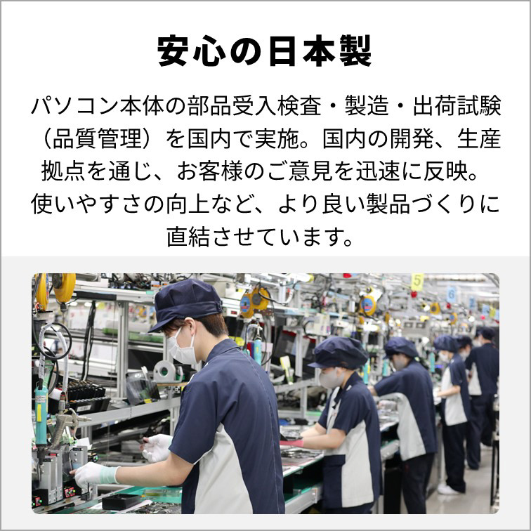 パソコン本体の部品受入検査・製造・出荷試験(品質管理)を実施。開発、生産拠点を通じ、お客様のご意見を迅速に反映。使いやすさの向上など、より良い製品づくりに直結させています。