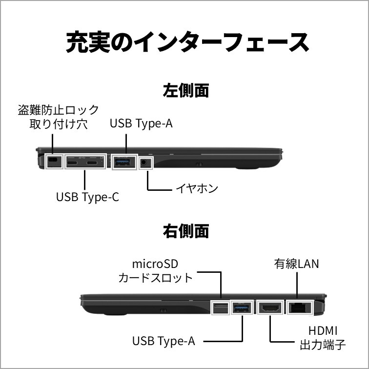 軽量・コンパクトなボディに充実のコネクタ類を搭載しています。出先で変換ケーブルが無くて困るようなことはありません。USBTypeC(USB4対応)コネクタを2つ搭載し、さらに多くの機器と繋がるようになりました。