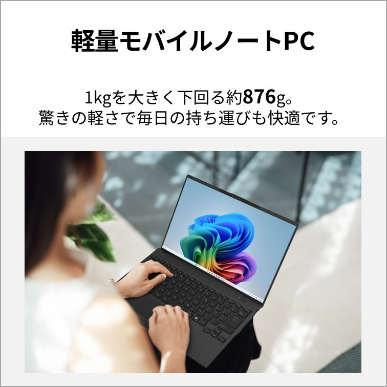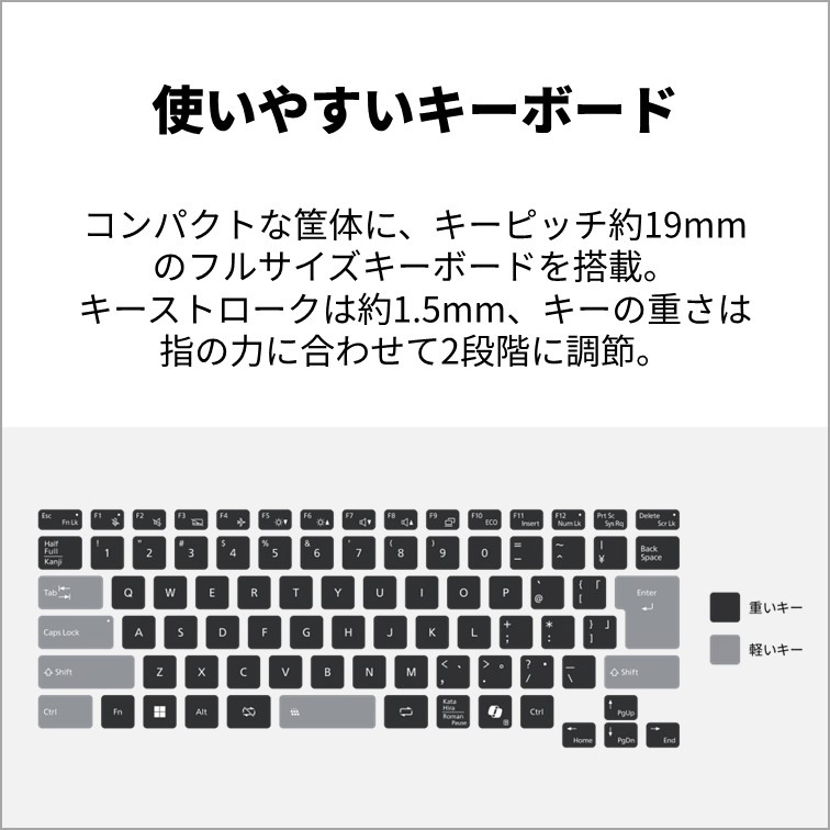 AI活用に便利な「Copilotキー」を搭載したキーピッチ約19mmのキーボードは、キーストロークを約1.5mm、キーの重さは指の力に合わせて2段階に調整。バックライトも付いているので、暗い場所でも快適にキー入力が可能です。