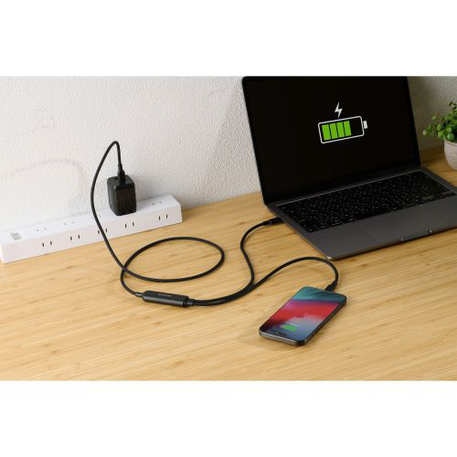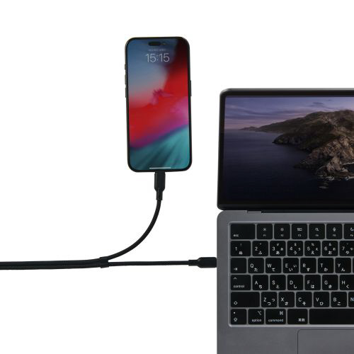 ケーブル1本でパソコンやスマートフォンなどの機器を2台同時に充電可能。散らかりがちなケーブルをすっきり配線でき、旅行や出張など外出先への持ち運びも1本に集約できます。