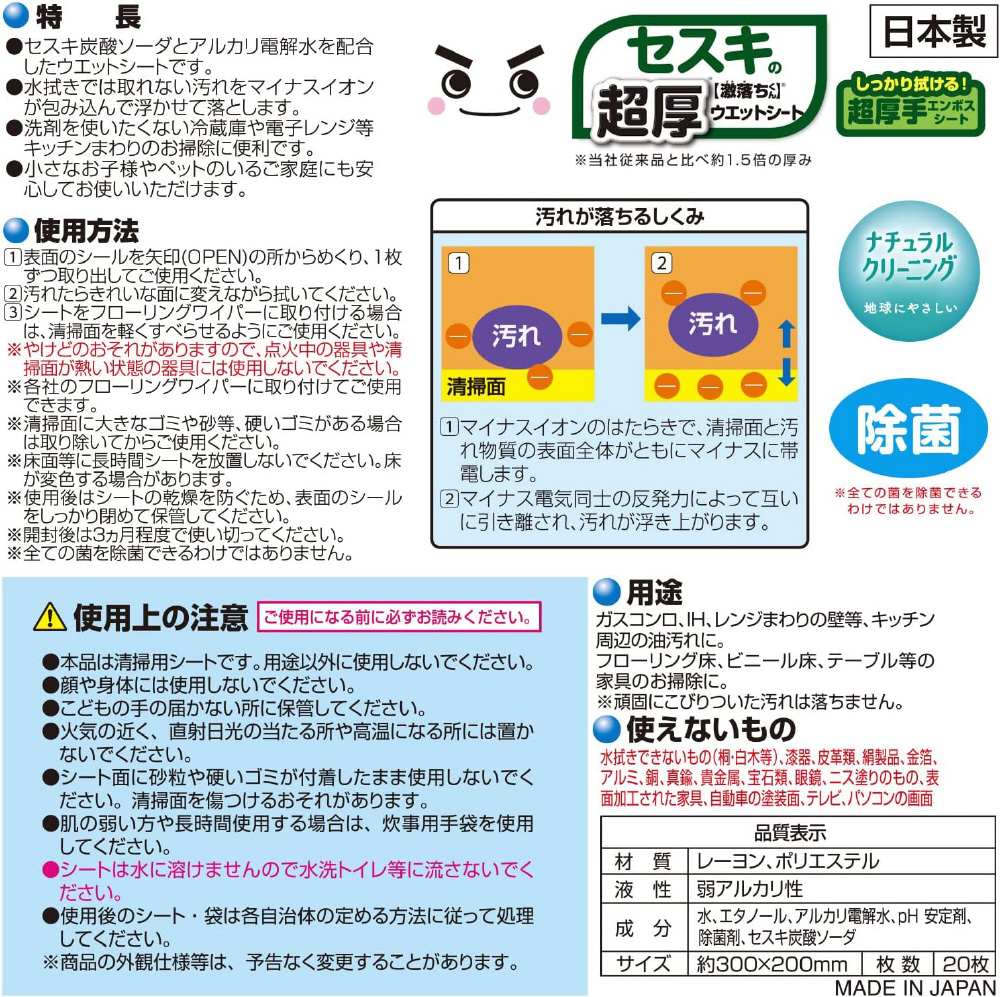 ・独自の方法で水を電気分解して得られるアルカリ電解水を使用した、セスキ炭酸ソーダ配合のおそうじ用ウェットシートです。・エンボスの凹凸が汚れを絡めて拭き取りとる、大きくしっかりふける丈夫な超厚シートです。・油汚れ、リビングの手アカ、ヤニ汚れなど水拭きでは取れない汚れをマイナスイオンが包み込んで浮かせて落とします。・界面活性剤は使用しておりません。
