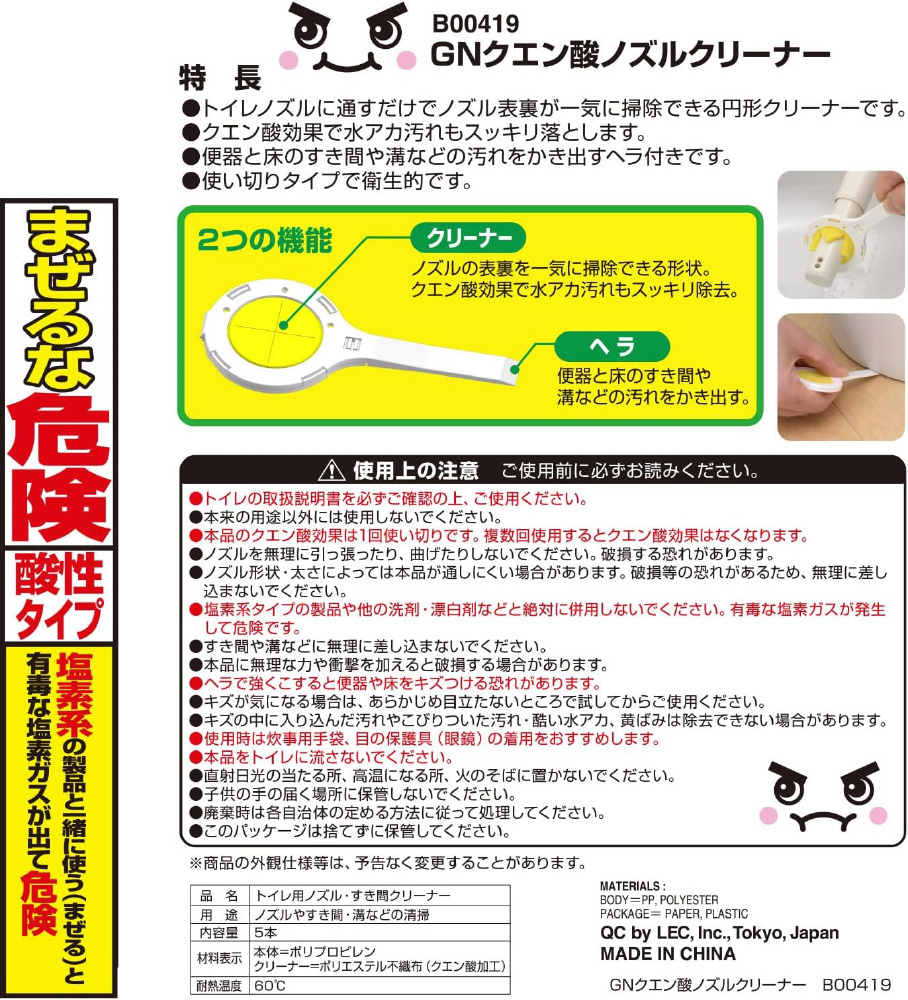 ●クエン酸効果で水アカ汚れもスッキリ落とします。●ノズルだけでなく、便器と床のすき間や溝などの汚れをかき出すヘラ付きです。●使い切りタイプで衛生的。 トイレノズルに通すだけでノズル表裏が一気に掃除できる円形クリーナーです。