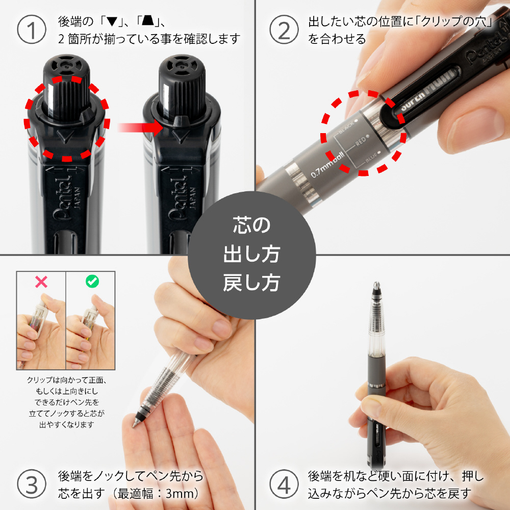 内蔵芯:黒ボールペン・赤ボールペン・青ボールペン・赤・青・HB鉛筆芯・蛍光イエロー・蛍光ピンク