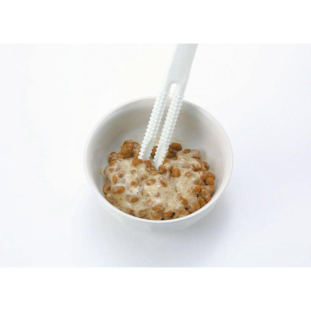 素早く簡単に納豆が混ぜ合わせられます。2本の棒と小さな突起が納豆のうまみを引き出す決め手です!小さな突起が空気を取り込みながら混ぜ合わせるのでまろやかでこしのある糸を作り出します。棒の先の凹みで、お好みの量をご飯によそうこともできます。