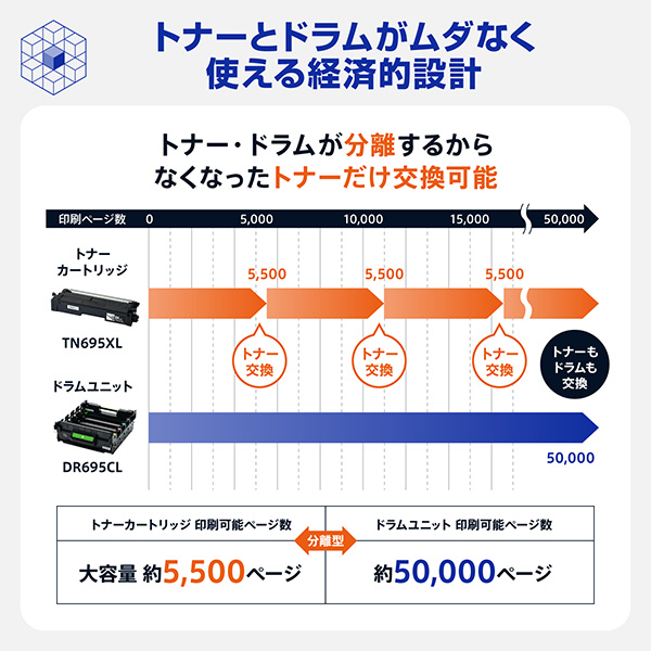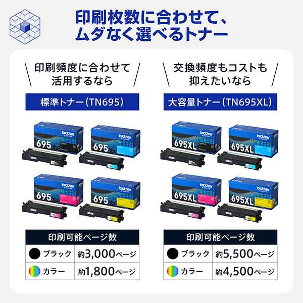 交換トナーは標準容量(TN695シリーズ)と大容量(TN695XLシリーズ)の2種類。
