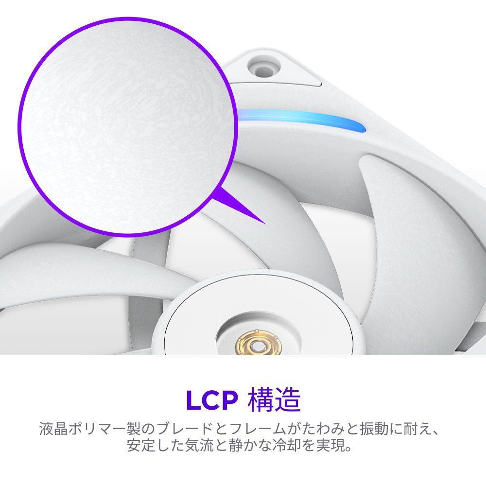 LCP構造、最適化されたブレード、ハイブリッドベアリングシステムにより、強力で静かな冷却性能を実現。