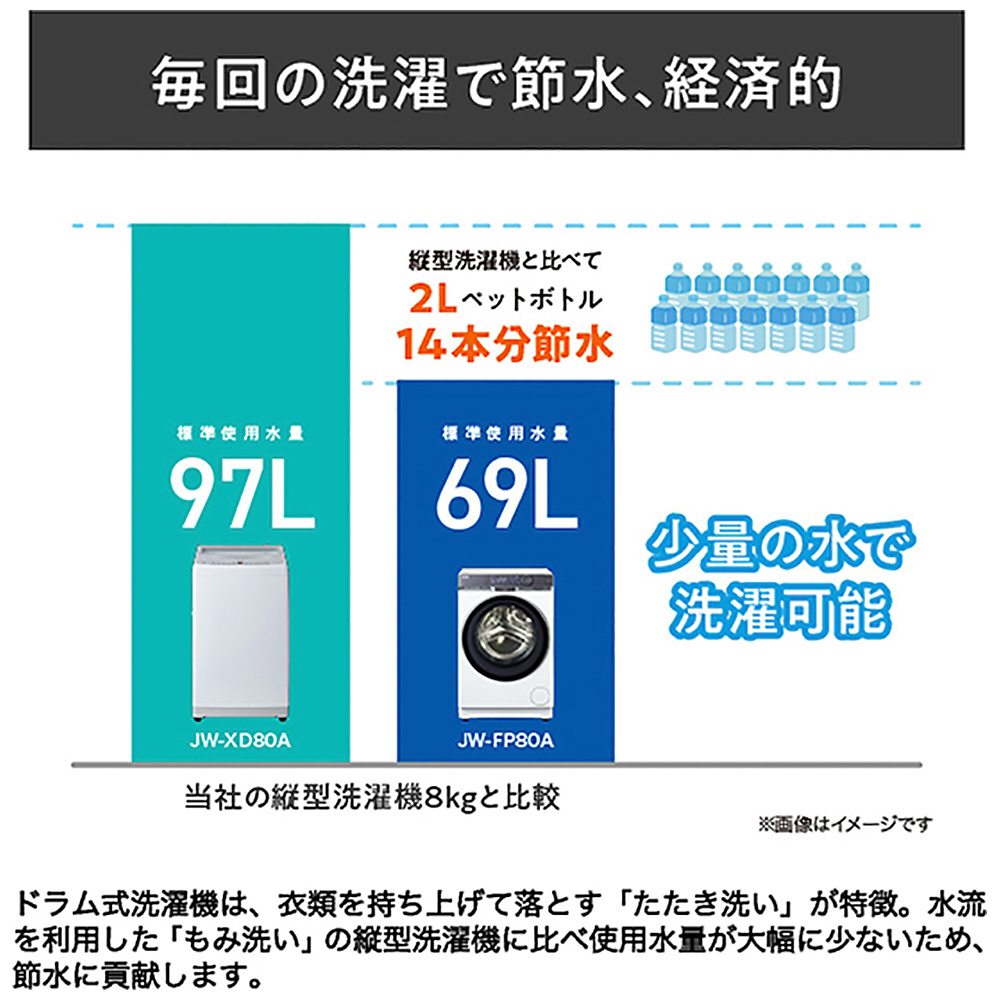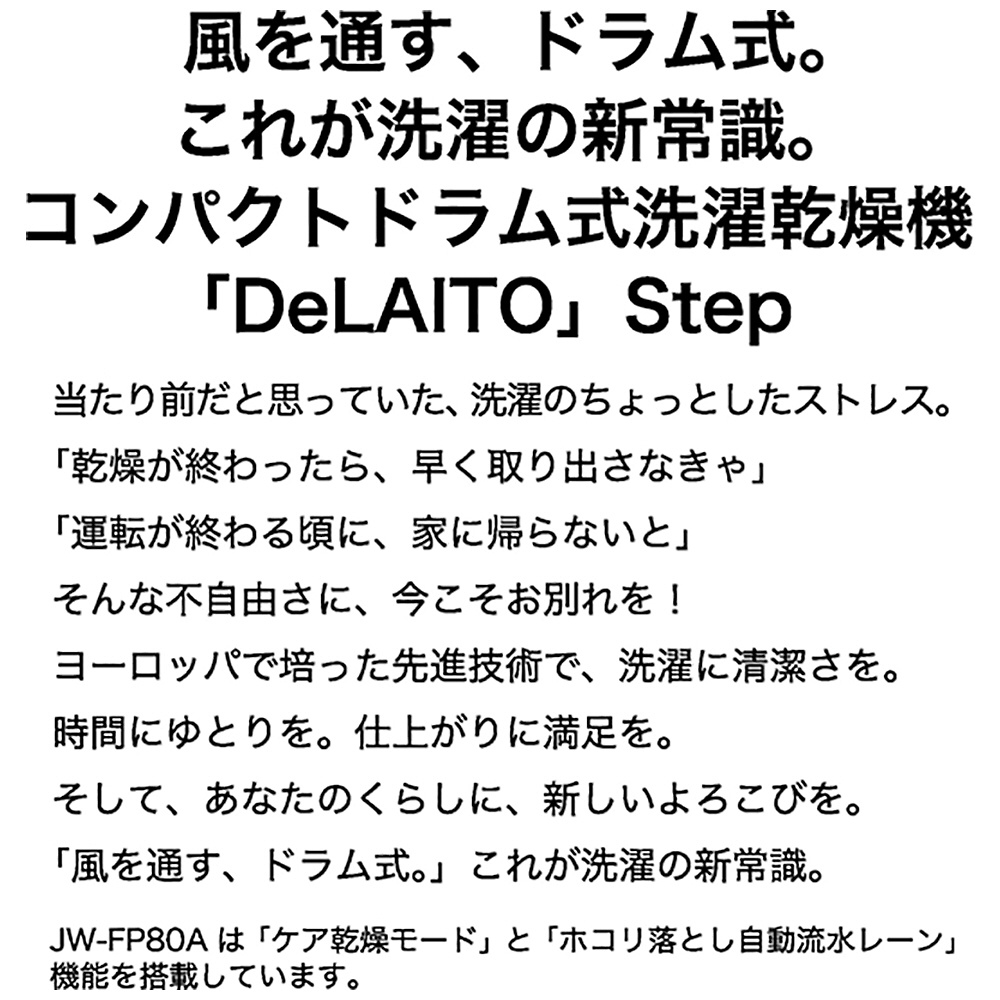ドラム式洗濯乾燥機 DeLAITO(ディライト) ホワイト JW-FP80A(W) [洗濯8.0kg /乾燥4.0kg /ヒーター乾燥(水冷・除湿タイプ) /左開き]