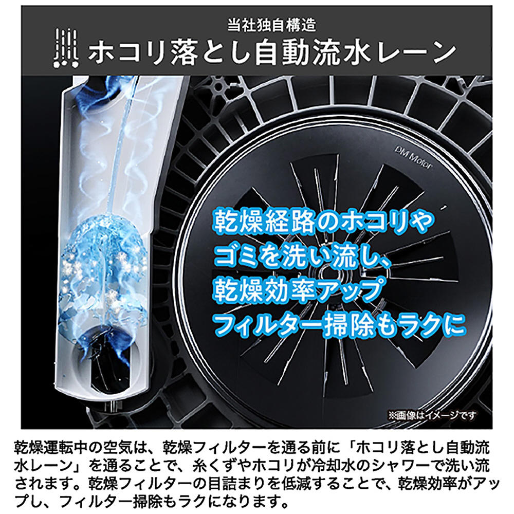 乾燥運転中の空気は、乾燥フィルターを通る前に「ホコリ落とし自動流水レーン」を通ることで、糸くずやホコリが冷却水のシャワーで洗い流されます。乾燥フィルターの目詰まりを低減することで、乾燥効率がアップし、フィルター掃除もラクになります。