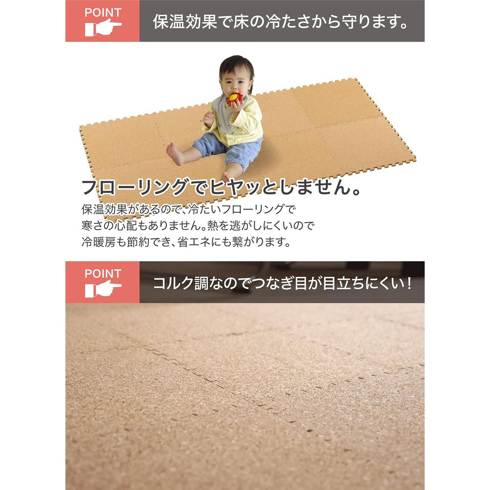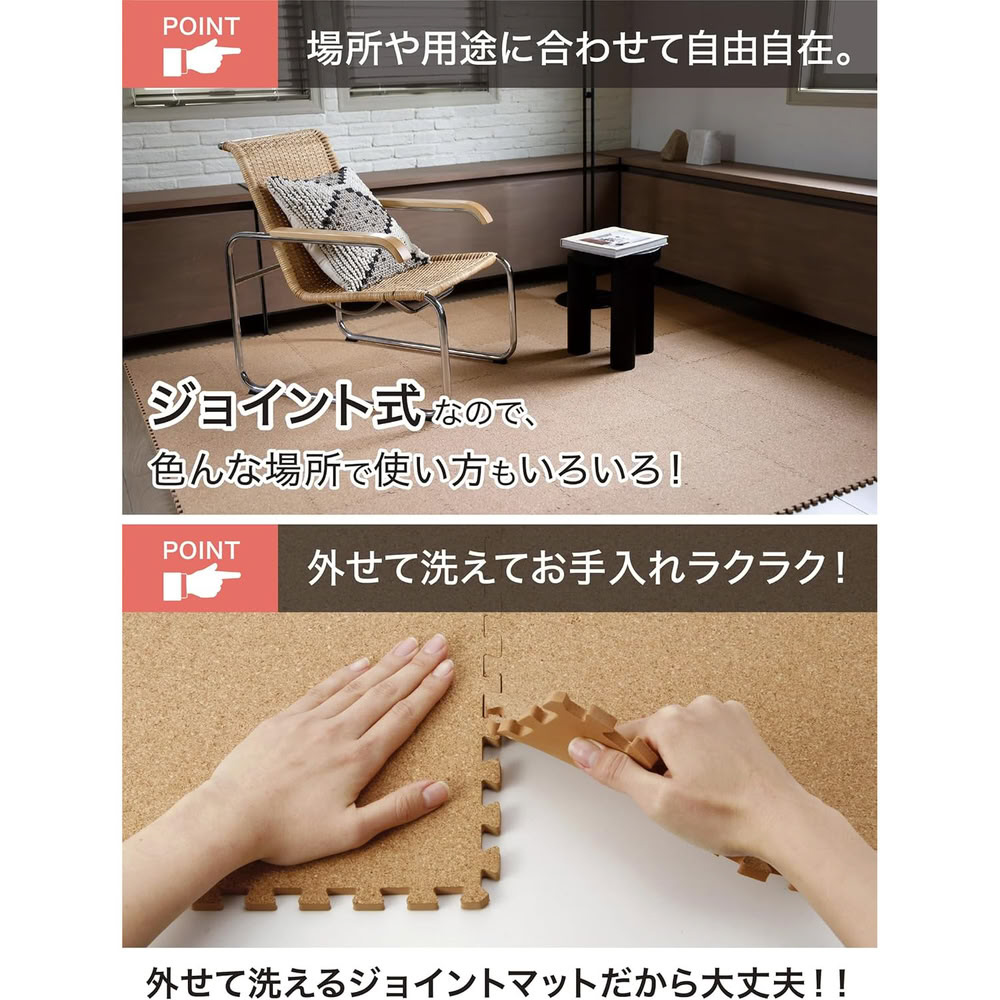 表面はコルクなのでジョイント部のつなぎ目が目立ちにくく、インテリアにこだわりがある方にもおすすめです。