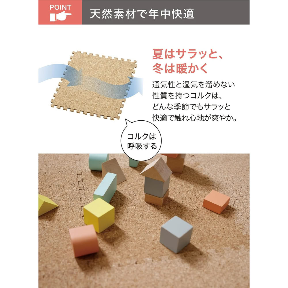 表面は天然コルクを使用しているので、夏はサラッと爽やかに、冬は保温効果もあるので暖かく快適な踏み心地が味わえます。床面の保護や、足音を吸収してくれるので、マンションなど音が気になるご家庭にも最適です。