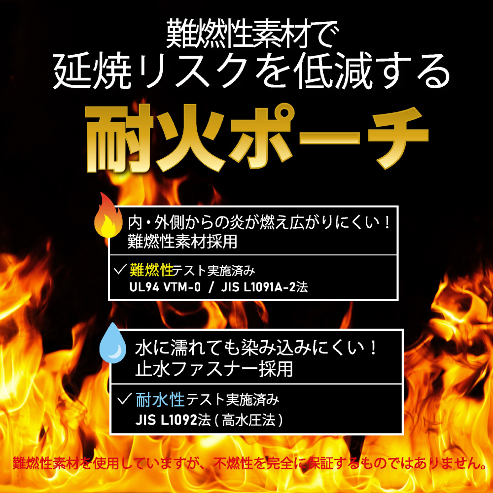 難燃性素材で延焼リスクを低減する耐火ポーチです。