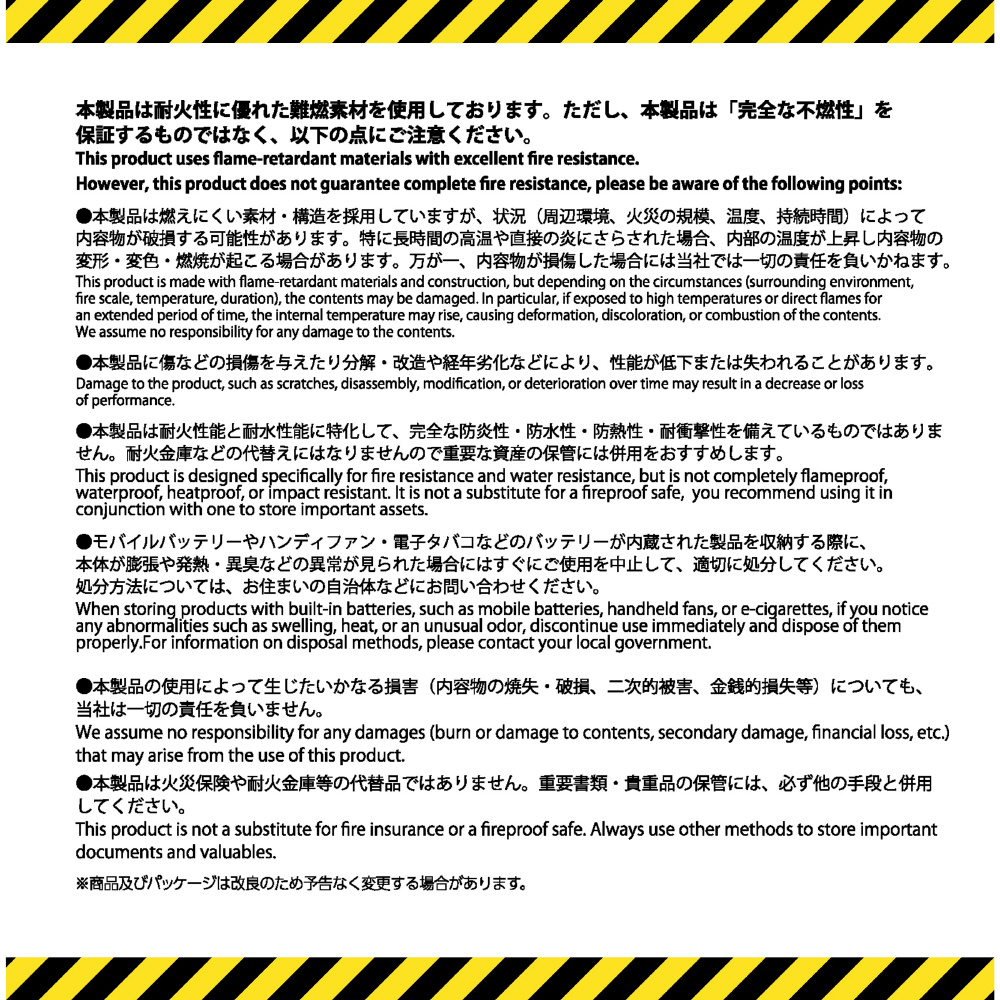 本製品は燃えにくい素材・構造を採用していますが、状況によって内容物が破損する可能性があります。