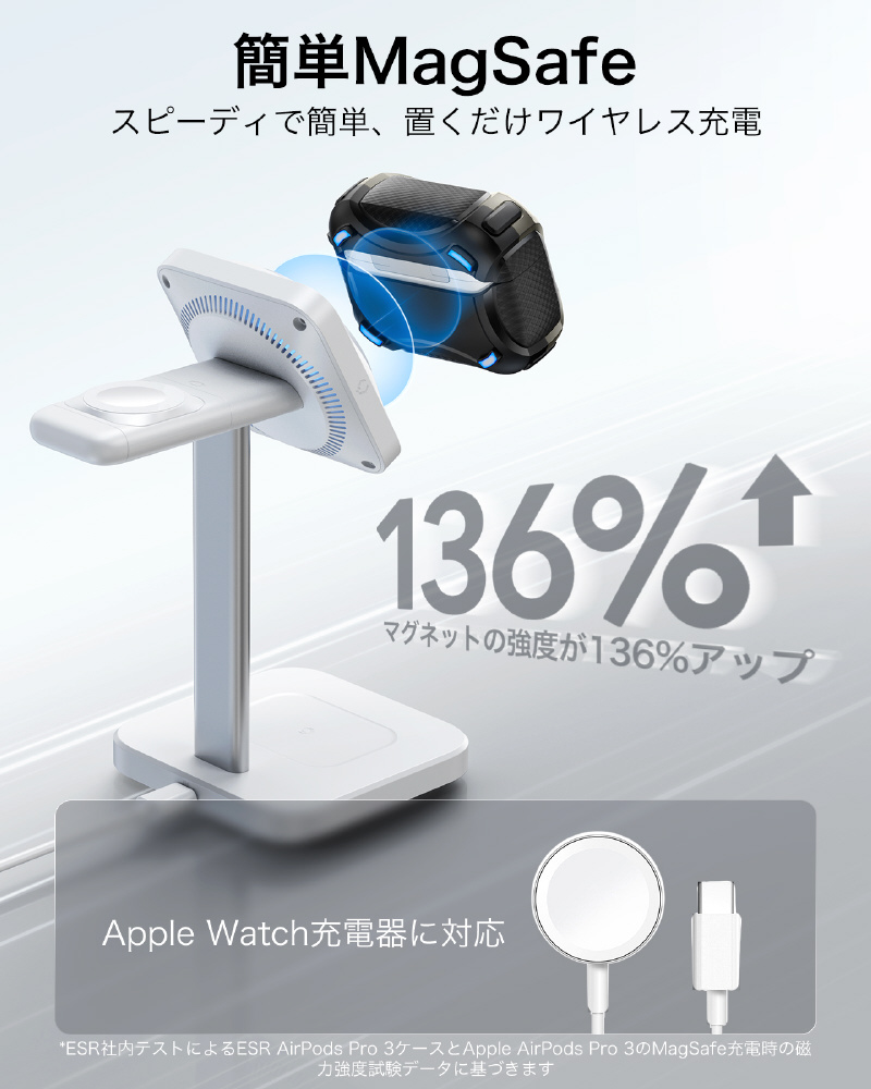 ケース背面に内蔵された磁力260gの強力マグネットにより、ワンタッチで快適なワイヤレス充電を体験できます。