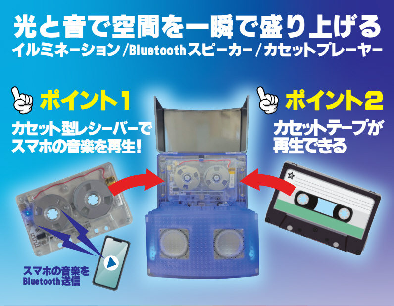 付属のカセット型Bluetoothレシーバーで、携帯やタブレットの音楽も再生可能。幅広い世代から好評