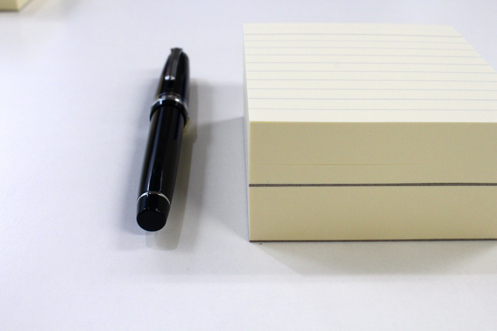 本文内容は横罫で、大学ノート罫線をイメージされる方はこちらがおすすめです。文字を揃えて書きやすいと思います。また、行ごとに要点を区切って書けるため、情報整理としてのメモを作成することもできます。一番上の空欄は濃い横線で仕切っているのでタイトル欄としても使用できます。両面印刷なので表裏どちらからでもお使いいただけます。7mm×10行/400枚