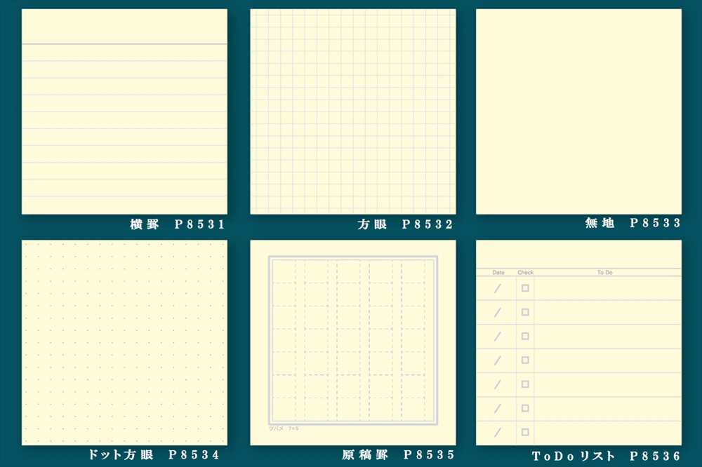 コンパクトなサイズ85mm×85mmで、デスクや電話の横などのちょっとしたスペースに置いたり、手帳やノートと併用するのに使いやすいです。天糊メモなので一枚ずつはがしながら使うことができます。6種類の罫線デザインでラインナップを取り揃えており、用途やお好みに合わせてお選びいただけます。