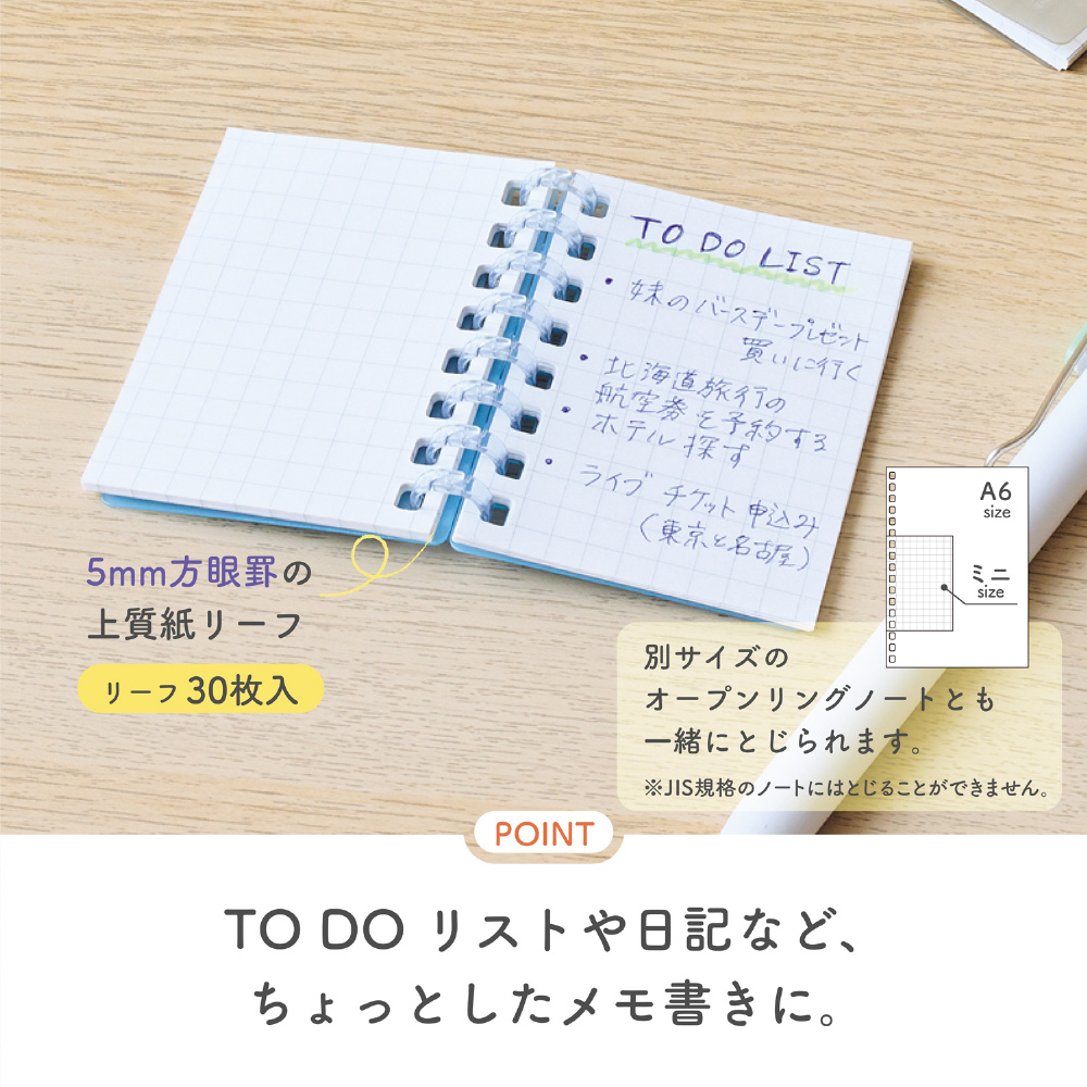 大人気のオープンリングノートにコンパクトなミニサイズが新登場!とじ具が開いてリーフの交換ができるミニサイズの可愛いノート。表紙は淡くおだやかな全 10 色。小さくて可愛い手のひらサイズのノートで、ちょっとしたメモ書きに便利です。透明のポーチに入れて、バッグチャームとして可愛く持ち運びができます。