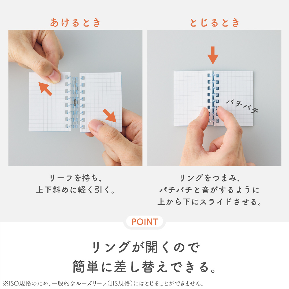 大人気のオープンリングノートにコンパクトなミニサイズが新登場!とじ具が開いてリーフの交換ができるミニサイズの可愛いノート。表紙は淡くおだやかな全 10 色。小さくて可愛い手のひらサイズのノートで、ちょっとしたメモ書きに便利です。透明のポーチに入れて、バッグチャームとして可愛く持ち運びができます。
