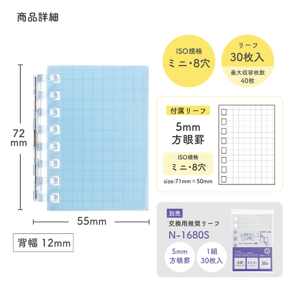 大人気のオープンリングノートにコンパクトなミニサイズが新登場!とじ具が開いてリーフの交換ができるミニサイズの可愛いノート。表紙は淡くおだやかな全 10 色。小さくて可愛い手のひらサイズのノートで、ちょっとしたメモ書きに便利です。透明のポーチに入れて、バッグチャームとして可愛く持ち運びができます。