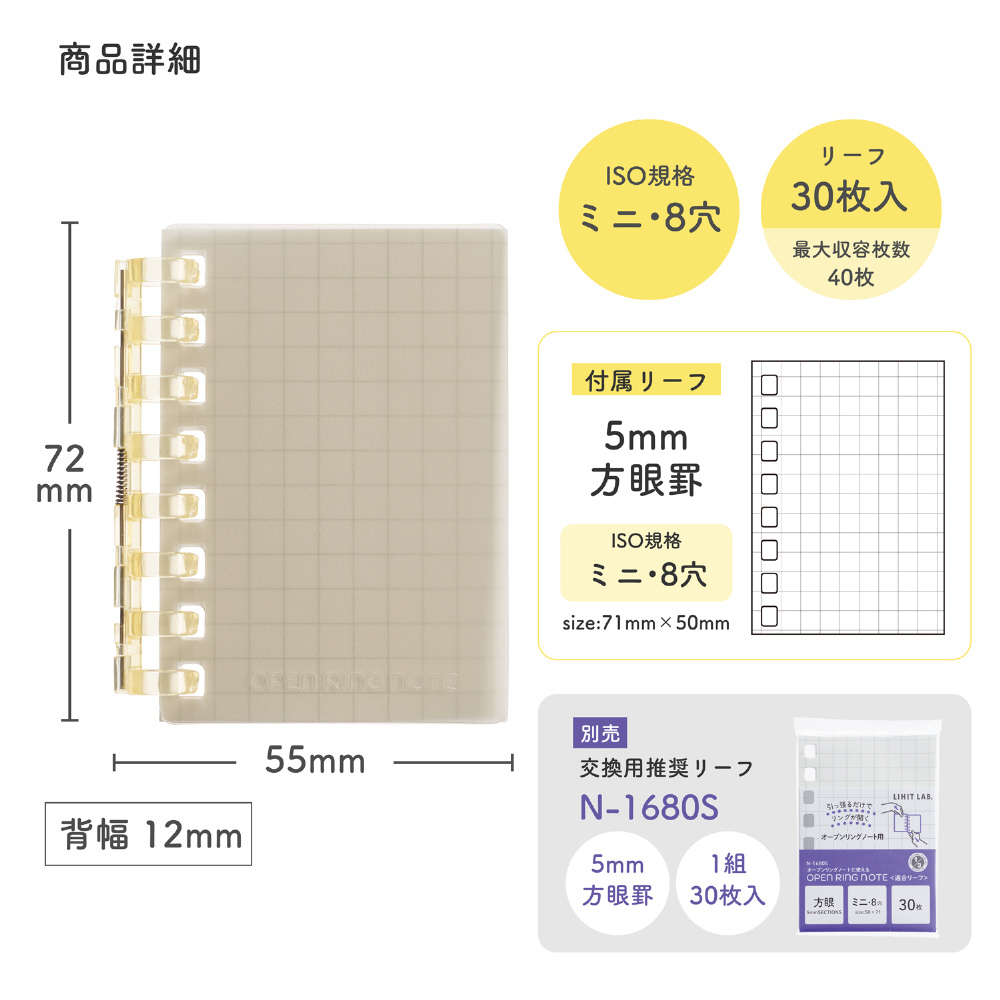 ノートのリーフは 5mm方眼罫 30 枚入りです。最大では 40 枚の収容が可能です。